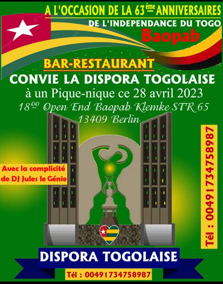 La diaspora togolaise en Allemagne va célébrer le 63ème anniversaire de l’indépendance de leur pays au tour d’un festin. Organisée par Anani Kodjovi AKAKPO ce pique-nique vise à rassembler tous les fils et toutes les filles vivants en Allemagne surtout à Berlin. Il s’agit d’un pique-nique qui aura lieu au Bar-Restaurant BAOPAB le jour après la célébration, 28 avril 2023 à 18h00 à Open End Baopab Klemke STR 6513409 Berlin.