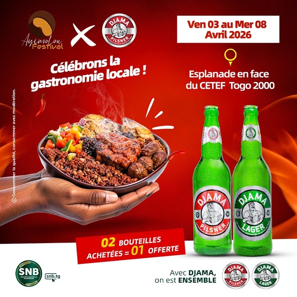 Du 3 au 8 avril 2026, le terrain en face du Centre Togolais des Expositions et Foires (CETEF) à Lomé sera le lieu de rencontre des amateurs de gastronomie et de culture togolaise pour la deuxième édition de l’Ayimolu Festival. La Société Nouvelle des Boissons (SNB), à travers sa bière emblématique Djama, sera au cœur de cet événement qui promet de célébrer la richesse et la diversité du patrimoine culinaire togolais.