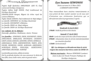 Voici les programmes des obsèques d’Eya Suzane SEWONOU décédée 13 Mars 2021 à DZREKPO-KOUTIVIME.