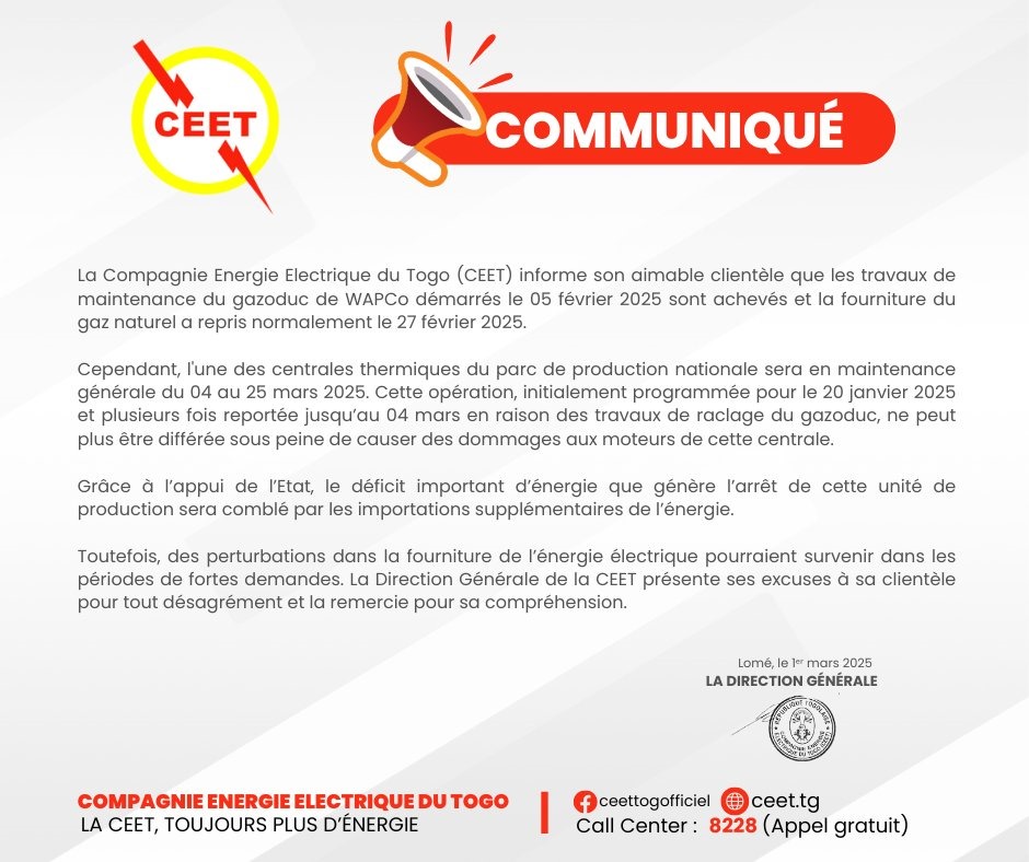 La Compagnie Energie Electrique du Togo (CEET) a annoncé la fin des travaux de maintenance sur le gazoduc de WAPCO, qui avaient débuté le 5 février 2025. La fourniture de gaz naturel a repris normalement le 27 février 2025. Cependant, la CEET informe également ses clients qu’une de ses centrales thermiques sera en maintenance générale du 4 au 25 mars 2025. C’est l’information qu’on peut lire à travers un communiqué signé du 1 mars par la direction générale.