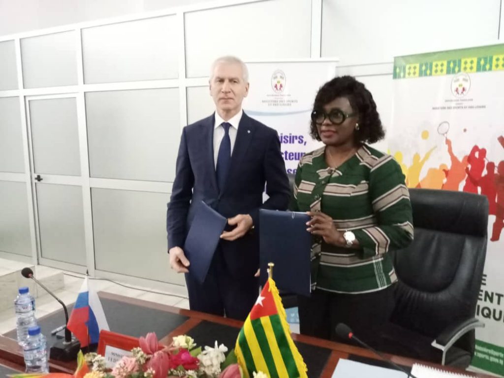 La Russie et le Togo ont renforcé leur lien de coopération en signant une convention de partenariat ce mardi 25 Avril 2023 à Lomé. C’était aucour d’une cérémonie solennelle qui a connu la présence des autorités sportives russes à la tête leur ministre des sports et de la jeunesse et madame le ministre des sports et des loisirs togolais, Dr Lidi Bessi Kama et sa suite. Une convention de partenariat d’une durée de trois ans a été paraphée par les autorités sportives russes et togolais. Selon le contenu du partenariat, les acteurs sportifs togolais pourront se former en Russie, les athlètes,les coachs, arbitres, acteurs sportifs et autres pourront désormais participer aux jeux et compétitions organisés par la Russie.