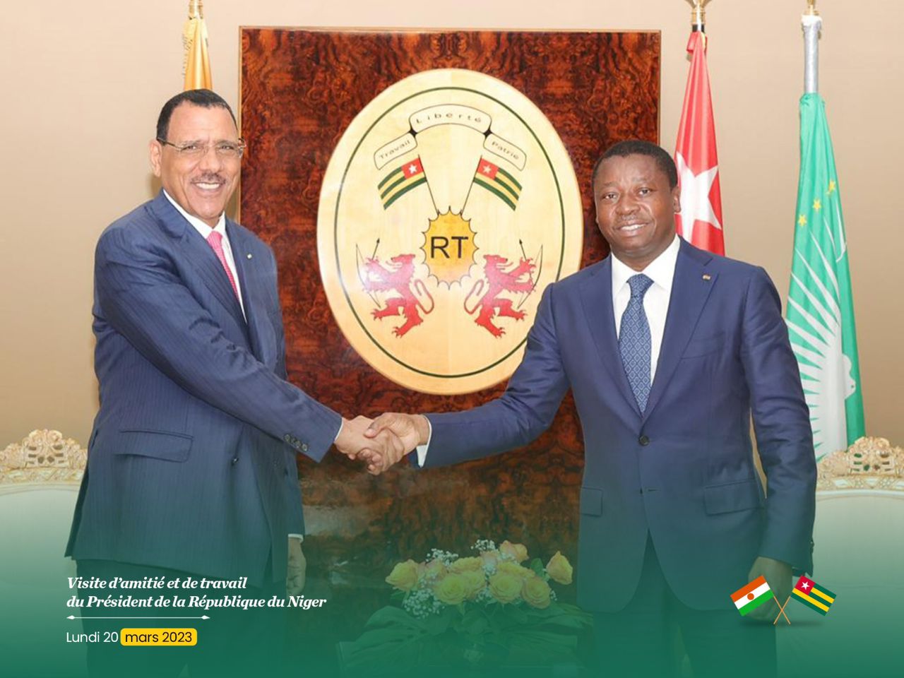 La délégation nigériens conduite par le Président BAZOUM ont foulé le sol togolais cette fin de matinée. Ces derniers n’ont pas perdu du temps. Ils sont reçus au palais de Lomé Il par le Président de la république togolaise Faure Gnassingbé. Cette visite officielle traduit les excellentes relations d’amitié et de coopération multiforme qu’entretiennent le Niger et le Togo.