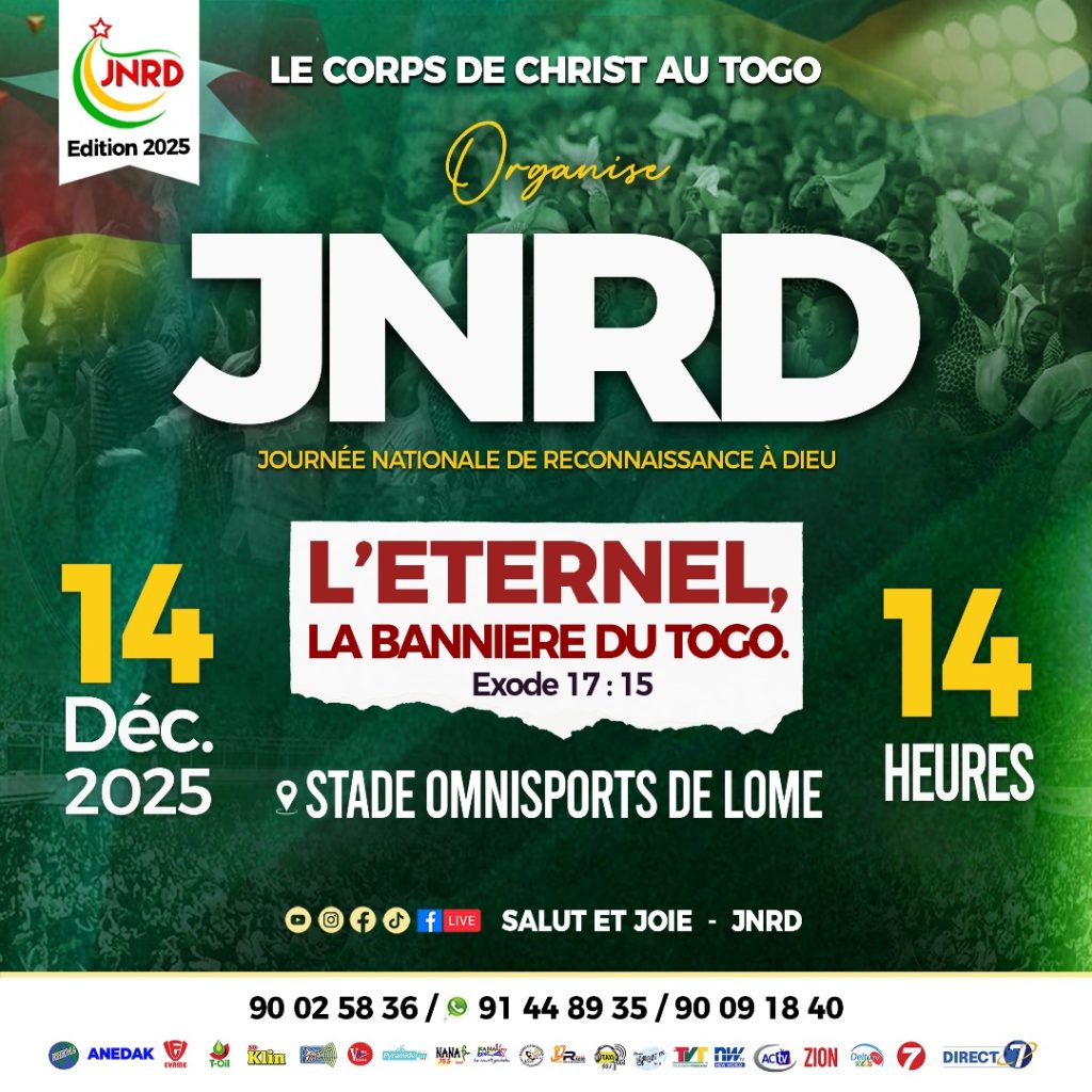 Le Corps de Christ au Togo et ses partenaires, dont le groupe Salut et Joie, annoncent la tenue de la 13e édition de la Journée Nationale de Reconnaissance à Dieu (JRND) demain, le 14 décembre 2025, au Stade Omnisports de Lomé. Cette journée spirituelle, devenue un rendez-vous incontournable dans le paysage togolais, vise à rassembler les citoyens autour de la foi, de la prière et de la gratitude.