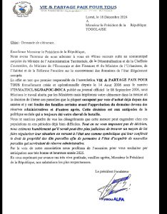 Dans sa lettre, l’Association VIE & PARTAGE PAIX POUR TOUS’ tout en soulignant que c’est une bonne initiative, pourrait avoir des conséquences négatives pour les populations, notamment pour les plus vulnérables. Elle appelle Son Excellence le Président Faure Gnassingbé en tant que père de toute la population à partager les douleurs des occupants victimes de ces ventes illégales. Monsieur ALFA plaide pour ses habitants et leur famille qui y vivaient depuis des années et qui n’ont nul part où allé.