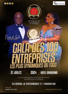 Organisé par le cabinet Eco Finances Entreprises, Le Gala des 100 entreprises est une cérémonie de remise de distinctions aux entreprises les plus performantes du continent. Un événement majeur rassemblant les principaux hommes d’affaires, des autorités africaines, des ambassadeurs des pays africains. Et pour cette 20 édition, elle va se dérouler le 27 juillet 2024 au Togo à l’Hôtel Sarakawa d’ailleurs sponsor.