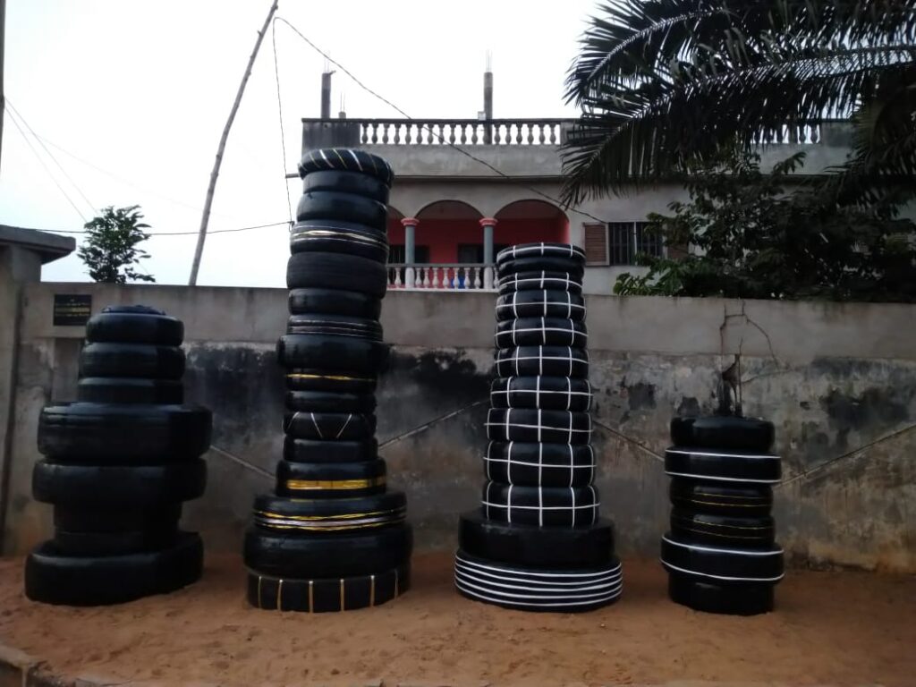 C’est son véritable et premier projet d’exposition réalisé au Togo plus précisément dans le quartier qui l’a vu grandir. C’est un projet pilote que nous avons intitulé « On a roulé sur la terre » il s’agit des sculptures composées des pneus usagés. Pourquoi nous avons fait usage de ce matériel ? C’est tout simplement parce que ces pneus sont les seuls qui puissent véritablement nous parler de la qualité de la terre. Ces matériels ont à plusieurs reprises été en contact permanent avec les sols avant de perdre leur qualité.