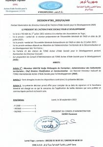 L’ONG Action d’Aide Sociale pour le Développement (ASD-Togo) met de l’ordre dans son organigramme. En croire la note de décision N°001/CA/ASD, et conformément aux lois et dispositifs
