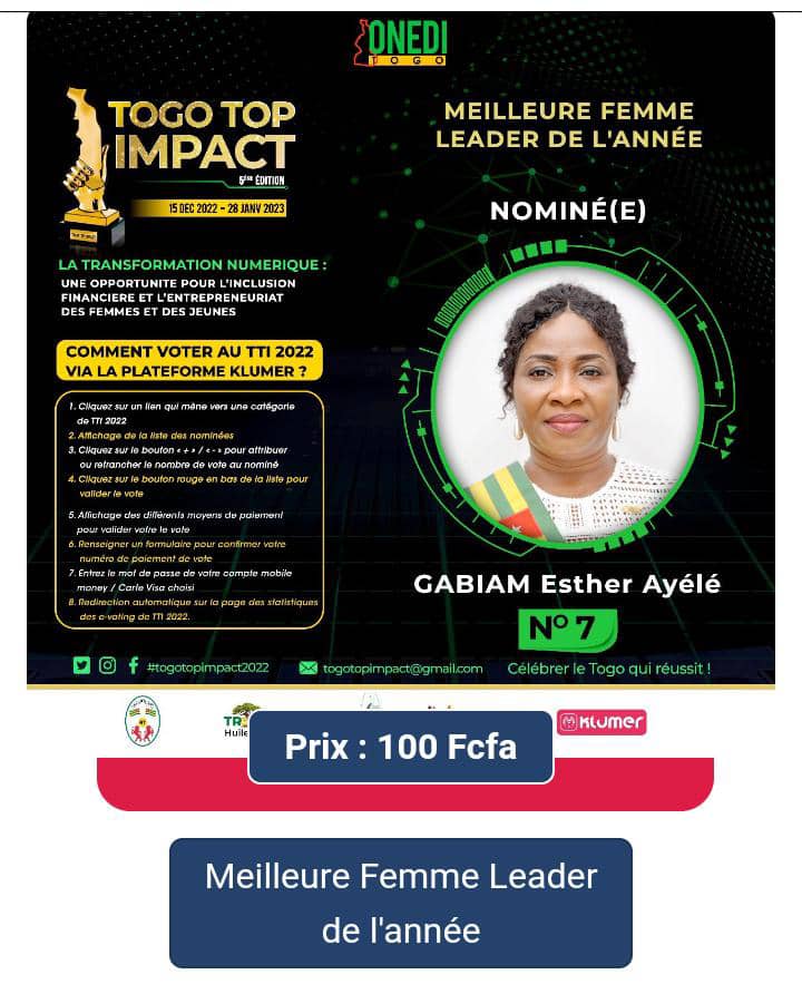 Et pour ce faire, elle est le N°5 des nominés, pour voter Mme Esther Ayélé Gabiam , il suffit de cliquer sur le lien https://1.klumer.co/togo-top-impact-2022/votings/5 parmi les nominés de cette catégorie. Choisir la catégorie Meilleure Femme Leader de l’année puis cliquez sur le visuel du candidat à gauche… Une page s’ouvre. Votez en appuyant sur +… Appuyez sur +selon le nombre de votes. Exemple : Je veux voter 2 fois, j’appuie 2 fois sur +. Cliquez après sur payer et le tour est joué.